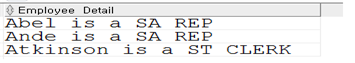 select last_name|| ' '|| 'is a' || ' ' || job_id as "Employee Detail" from employees;